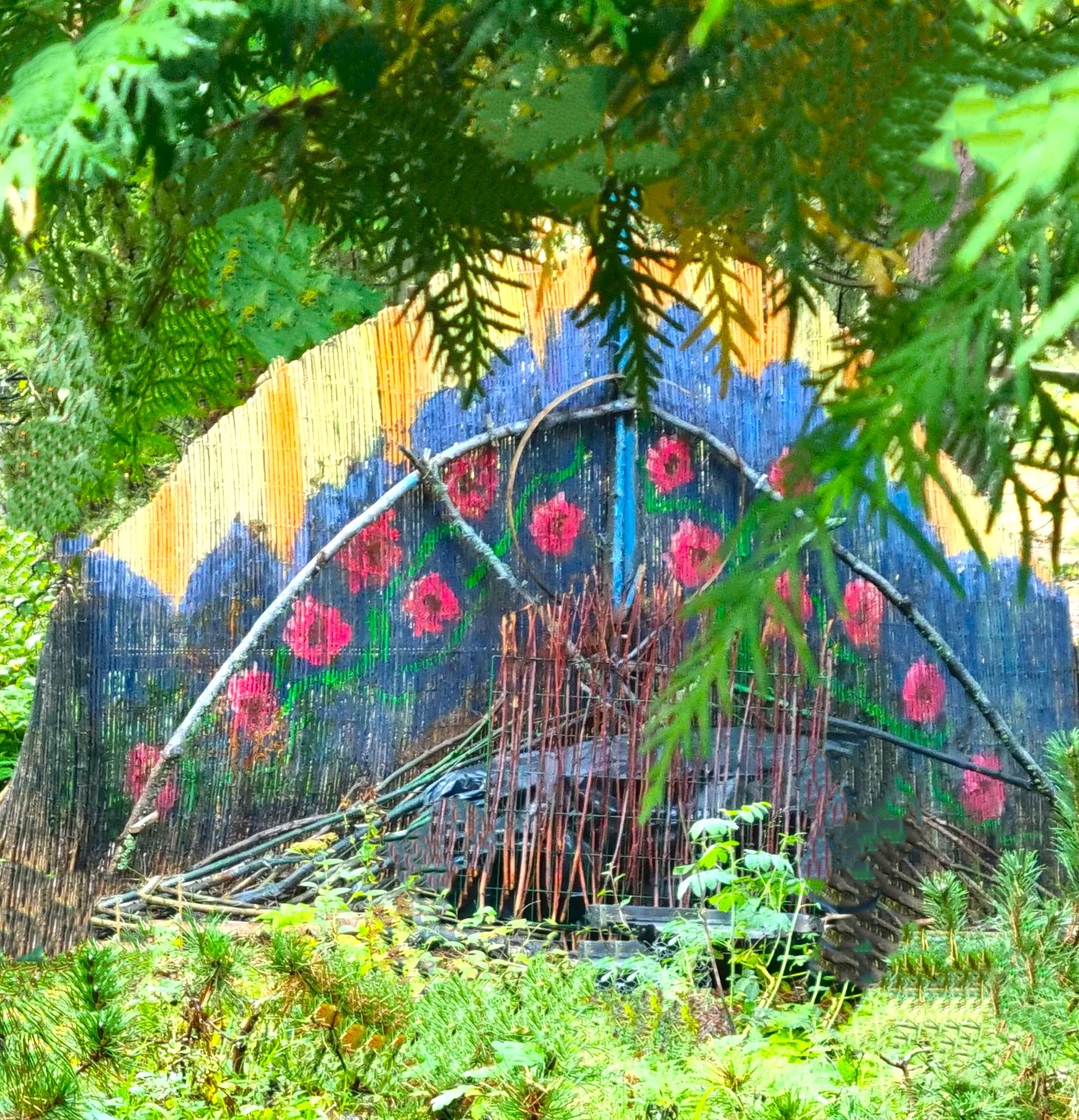 V. 2021 ilmmestyi peura- ja kauriseste ja parkkipaikan taakse. Materiaalina kierrätysrimat, puukarahkat ym. Taakse oli piilotettu kasa poisheitettäviä vanhoja suksia.